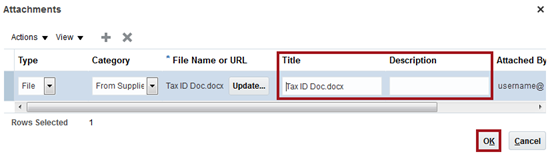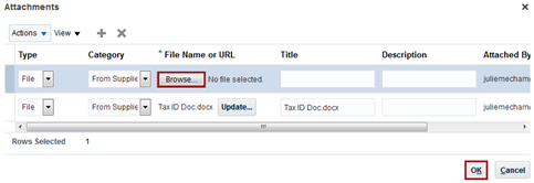 Click OK. The pop-up closes and the Supplier's W-9 populates in the Attachments field. |