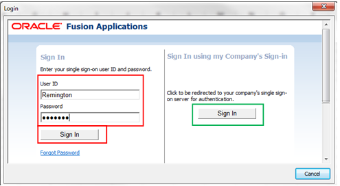 The Oracle Fusion Applications sign in window appears. Select Sign In in the Company’s Sign in section.
