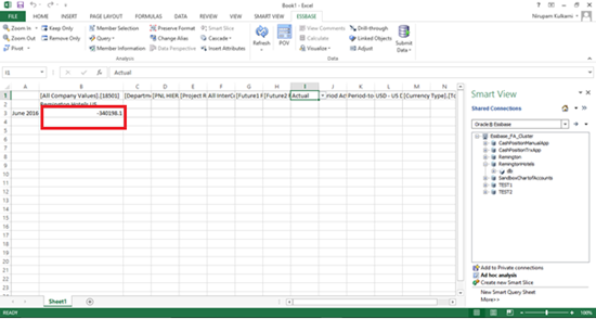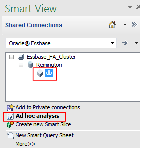 The Essbase data populates in Shared Connections. Select the desired data cube from the navigation tree. Select Ad hoc analysis. Note: Essbase Cubes house multiple types of data that is accessible using the Smart View Excel add-in. |