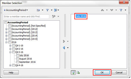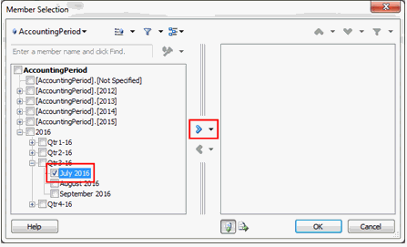 The Member Selection window appears. Perform the following to configure the Member Selection window: Navigate the member tree until you locate the desired member. Enable the desired member’s checkbox. Select the right arrow to add the member to the configuration |
